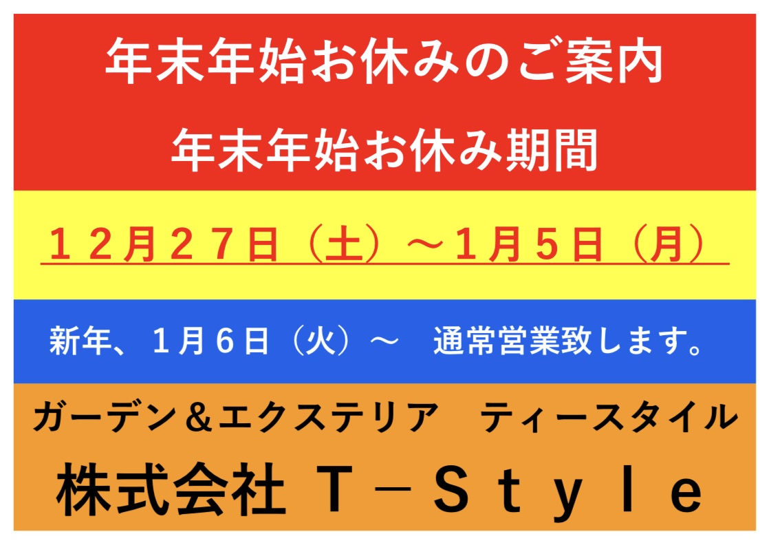 年末年始のお休み期間は、12月27日〜1月5日迄となります。 新年1月6日 火曜日より、通常営業致しますので、よろしくお願い致します。 今年もティースタイルをお選びいただきまして、誠にありがとうございました。 当社をお選びいただきましたお客様のおかげで、本年も大変忙しくさせていただき、大変感謝しております。 工事につきましては、ご予約を大変多くいただきました関係上、長らくお待たせしてしまい、お急ぎのお客様にはご迷惑をお掛けしてしまい、申し訳ございませんでした。 ...